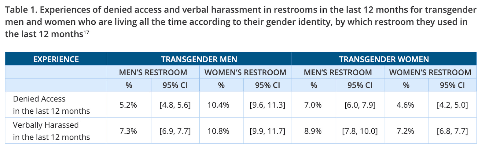 Now, both studies resulted in a lack of evidence that allowing transgender people to use restrooms according to their gender identity increased harm to people who are not transgender. However, it was a consistent finding across studies and over spans of time that transgender people repeatedly report being denied access to gendered spaces and experience verbal harassment or physical assault. Not only are they reporting these incidents with frequency, but it is more likely to occur when transgender people who are living their day-to-day lives according to their gender identity use the restroom of their sex assigned at birth.